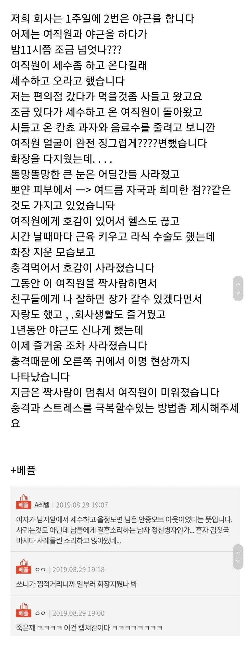 여직원과 야근하다 생긴일, 남자는 충격을 먹는데... 커뮤니티01 0 3182 0 여직원과 야근하다 생긴일, 남자는 충격을 먹는데... 0 유머, 재미, 움짤, 유머사이트, 유머커뮤니티